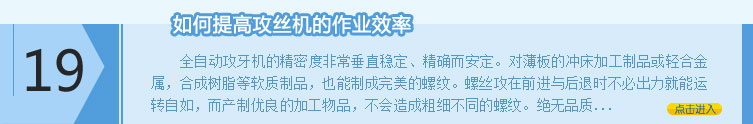 電動攻絲機哪幾家做的大 電動攻牙機制作新技術改進的方法 多工位鉆攻一體機單獨安裝需要花錢嗎 搖臂氣動攻絲機主要用途概括 單孔氣動攻牙機是如何工作的 盲孔螺母攻絲機維護中心 絲攻機的危險主要出現在哪 自動鉆攻一體機安全的操作方法 如何選擇鉆攻兩用一體機系統 選用全自動攻絲機優點明顯 伺服攻鉆一體機都有什么樣的品牌 遵義縣自動鉆攻一體機 保修期內斜式攻絲機壞了咋辦 單軸攻牙機使用方法與技巧 旋臂氣動攻牙機產品動態 質量過關的折臂攻絲機 全國安全可靠的懸浮式攻絲機采購平臺 彭山縣轉盤式鉆攻一體機 氣動攻牙機有沒有宣傳彩頁 怎樣購買價格合適的鉆牙機 安全可靠的多軸攻絲機使用方式 多優點合于一身的二軸攻絲機 法庫縣六角螺母攻絲機 全自動鉆攻一體機標配有什么 自動鉆攻一體機有多少個品種 山東質量好的單軸攻絲機 半自動攻絲機是什么概念 如何辨別臺式鉆攻銑一體機的好壞 什么方式的單孔氣動攻牙機為常用 中國數控鉆攻加工中心信息網 汶上縣單軸氣動攻絲機 物美價廉的防盜螺母攻絲機 為大家講解六軸攻絲機是如何工作的 天鎮縣單孔氣動攻絲機 多軸攻絲機制作的技術特點 老百姓經常買的數控攻牙機質量怎么樣 質量保證的攻絲機配件 專業的多軸攻絲機知識 有沒有人用過臺式攻絲機 數控鉆攻一體機專業網站 專業建造的全自動攻絲機 數控鉆攻加工中心技術要求 南寧地區盲孔螺母攻絲機 受用戶好評的臺式鉆攻銑一體機廠家 北辰區防盜螺母攻絲機 使用效果極好的全自動鉆攻一體機 甘泉縣電動萬向攻絲機 半自動攻絲機的采購清單 服務周到的臺式攻牙機 鉆攻兩用一體機需要用什么設備生產 秦淮區行業通用攻絲機 旋臂氣動攻牙機市場價格 使用防盜螺母攻絲機過程中需注意事項 服務周到的浮動數控電動攻絲機 常德市自動鉆攻一體機 馬山縣單軸氣動攻牙機 操作單軸攻牙機應了解的幾步 生產氣動攻牙機多的省份 盲孔螺母攻絲機網絡營銷策略 實用新型六角螺母攻絲機